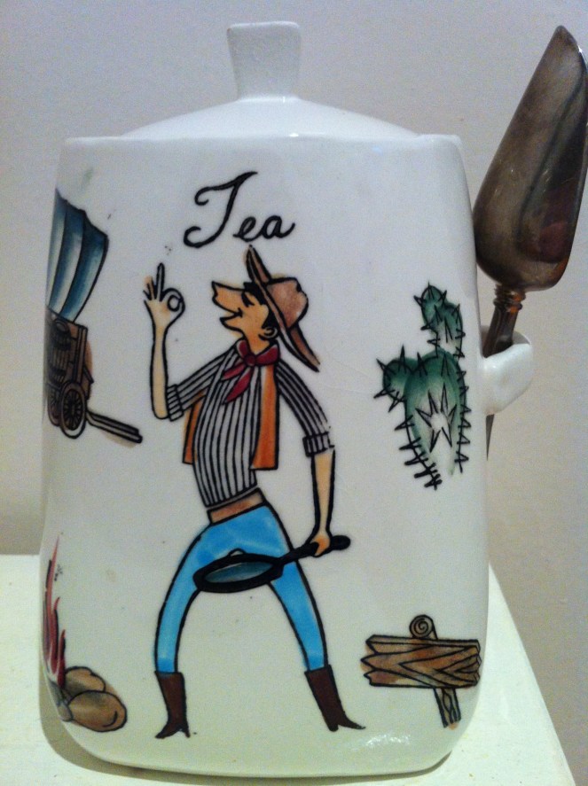 Goodness only knows why a cowboy wielding a frying pan dispenses my loose-leaf tea, but apparently the 1950s/60s Japanese manufacturers considered it to be the height of kitchen chic to do so.